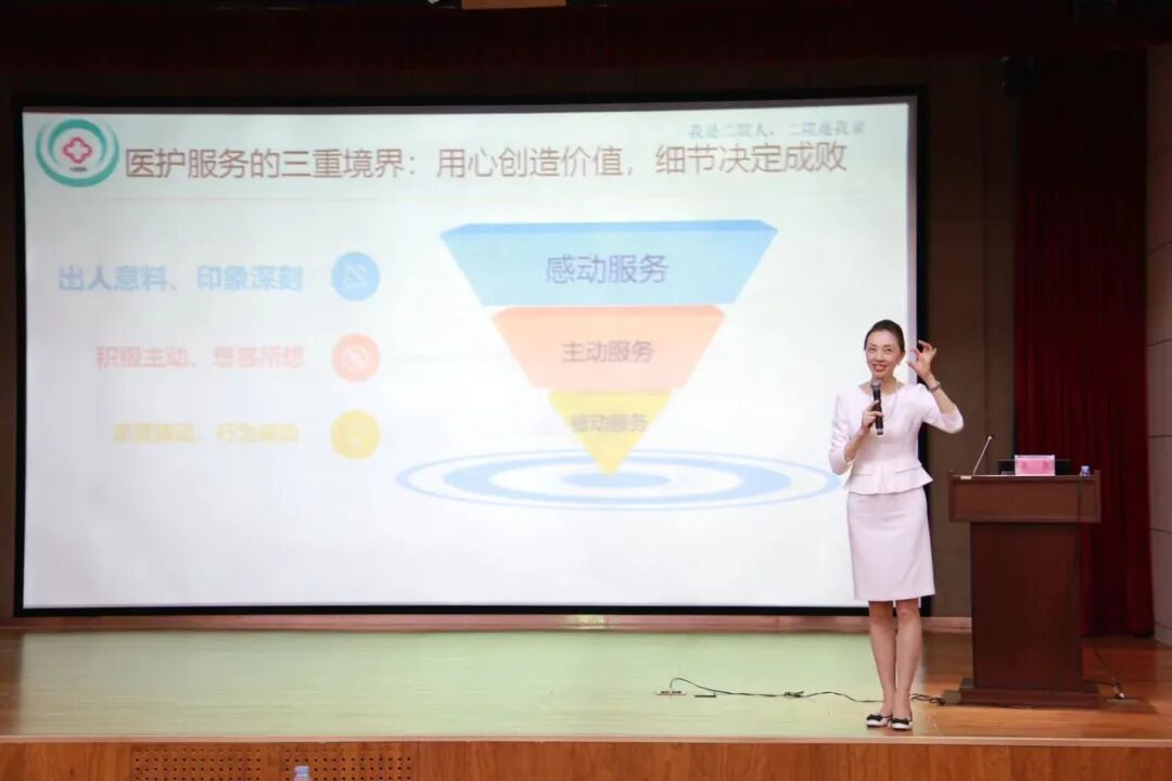 李泉老师运用详实生动的案例和幽默风趣、通俗易懂、富有感染力的语言,从医护服务意识和心态、肢体及有声语言效能提升等多方面内容激发医护人员主人翁意识,提倡主动服务和感动服务,鼓励大家为患者提供个性化、细节化服务,并通过理论讲述、现场演示等多种形式,指导大家掌握正确的服务礼仪规范,精彩授课赢得了参训人员的阵阵掌声。