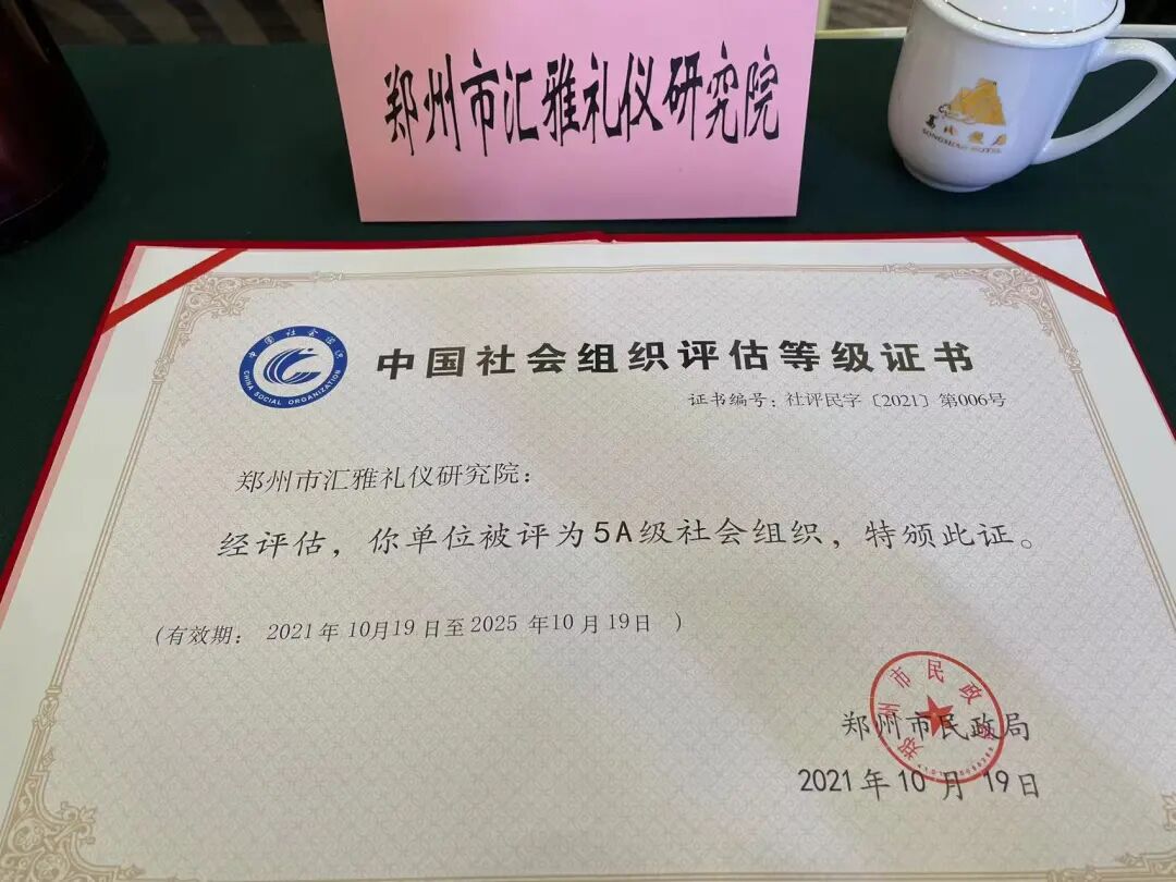 根据《社会组织评估管理办法》(中华人民共和国民政部第39号令)的要求,2021年,郑州市民政局委托专业评估机构对近千名社会组织从基础条件、内部治理、工作绩效、诚信建设和社会评价等五个方面进行了评估。经过现场评估、评估委员会评审、公示、评估复核委员会复核和市民政局确认,最终确定33个市级社会组织的评估等级。汇雅礼仪研究院等6个社会组织被评为5A级,李泉院长参加会议并接收评估等级证书及牌匾。